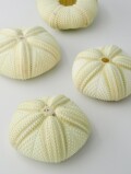 黄緑色をしたウニ殻。ガンガゼ類の中では大型になる種ですが他のガンガゼ類と比べるとに平たい形状をしています。砂泥底上に生息しており生体は鮮やかな赤色をしています。