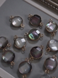 黒真珠の母貝であるクロチョウガイを加工したつなぎパーツです。メッキ調の枠の両端にカンが付いているのでパーツ同士のつなぎに使用できます。
