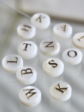 貝ボタンなどの装飾品の素材であるタカセガイを削り出して作られた貝殻ビーズです。裏表に金属調の文字が付けられており表面が樹脂でコーティングされています。