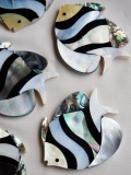 真珠の母貝である淡水真珠貝とクロチョウガイ、虹色に輝く独特の光沢が美しいパウアアバロン(ヘリトリアワビ)を組み合わせて作られた貝殻パーツです。裏面は平らなのでそのまま金具を貼り付けるだけで帯留やブローチ、ヘアゴムなどのアクセサリーを制作できます。周りを縁取るビーズ刺繍にもおすすめ。他のモザイクパーツはこちら