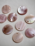 淡いピンク色の天然淡水真珠貝を削り出して作られた貝殻ビーズです。真珠層独特の光沢と柔らかい天然素材ならではの風合いをお楽しみください。飾りボタンとして使用するのもおすすめです。