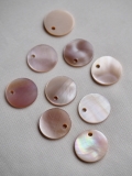 淡いピンク色の天然淡水真珠貝を削り出して作られた貝殻ビーズです。真珠層独特の光沢と柔らかい天然素材ならではの風合いをお楽しみください。飾りボタンとして使用するのもおすすめです。
