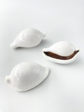 白い瀬戸物にも見える美しい貝で内面は紫褐色をしています。海中で生きている時には黒に白点をちりばめたマントのような外套膜に覆われています。。