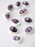 タカラガイの殻は表面を塗り重ねていくように成長し、殻を削れば層により様々な色が現れます。