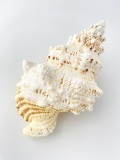 大型の巻貝で殻の表面はイボ状突起で覆われ凸凹しています。殻口は薄い橙色で外側にははっきりとした歯を持つ全体にに白くて大きいので区別は容易です。若干の貝口の欠けが含まれている場合がございます。