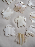 淡水真珠貝をカメの形にカットし、穴あけ加工をしています。