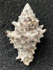 本種最大の魅力は何といってもやはり、まさに鬼の拳と言わんばかりのその名に恥じぬ力強いデザインで間違いないでしょう。殻表に端正に並ぶ棘はどれも短くも鋭く伸び、本種が鬼の名を背負うことに微塵も疑問を残しません。殻口外唇には丸みを帯びつつも確かな存在感を放つ歯状の突起が並び、これが黒く染まる様も相まって、狭い縦長の殻口をさらにシャープに印象付けます。もはや写真から質量を感じんばかりの印象の通り殻は非常に重厚で、白と黒を基調にしたカラーリングも本種が持つ特有の迫力の一翼を担っています。ここに薄いフィルム状の殻皮が張り付くことにより、この白は殻口周辺を除いて夕空を思わせる飴色を帯び、ノスタルジックな味わいとなり本種の魅力を引き立てます。私がこの標本をクリーニングしていない理由の一つは、この色彩を手放すのがあまりにも惜しいからです。クリーニングには次亜塩素酸ナトリウムを使うため、主にタンパク質で構成される殻皮は無惨にも全て溶けて消えてしまうのです・・・。そのうち、薬品は使わずに簡単に仕上げた姿で再登場するかも分かりません。