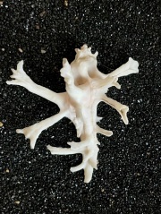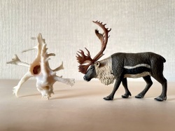 殻の色や質感、デザイン等は概ねイチョウガイ(第15回参照)と一致するものの、殻の全周囲に配置される棘が本家イチョウガイと比べ極端に長く伸びるのが本種最大の特徴であり、その様は見事の一言に尽きます。この棘の先端はイチョウの葉のようにヘラ状に扁平し、さらに棘自体の長さゆえに、和名の通り殻全体のバランスがまるでトナカイの角であるかのような印象を与えます。本種にこの名を与えた研究者の、無脊椎動物のみならず哺乳類にも明るい知識の深さと卓越したネーミングセンスには脱帽するばかりです。残念ながら我が家には参考資料としてお見せできる本物の角はまだありませんので、なかなかに精巧な模型と並べた写真で見比べてみてください。本種は単に類稀なる美しさを誇るという点のみならず、やはり鹿の名を背負うだけあってその純白の殻表は吹雪に凍てつく大角をかざした美しい雄ジカを思わせ、シカ撃ちの私としては胸がときめかないはずもなく大変に愛着のある貝の一つとなっています。