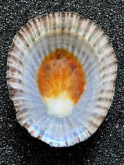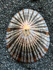 殻表には殻頂から放射状に濃褐色の模様が走り、これを松の葉に擬えこの和名が与えられました。個体差こそありますが、発色の良い個体では外縁が鮮やかな暗青色で彩られ、ブルーのリングとなって浮かび上がります。しかし、本種最大の魅力はその内面にこそあります。橙色の中心部を真珠光沢が取り囲み、さらに殻表の放射模様が透かされることで大海原に登る旭日を思わせる雄大な趣き。殻表からは想像もできないあまりの意外性に、思わずため息が漏れてしまうのです。一見すると非常に地味で、磯で手に取ることさえ億劫になるほど花がないように思われがちな本種ですが、一度岩から剥がせばその隠された魅力に胸を打たれることでしょう。ちなみに、古くは”ウシノツメ”という名が与えられていたようで、酪農家の友人に聞いてみたところ、確かにたまにこんな模様の爪の個体がいるよと教えてもらいました。
