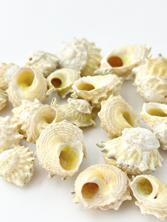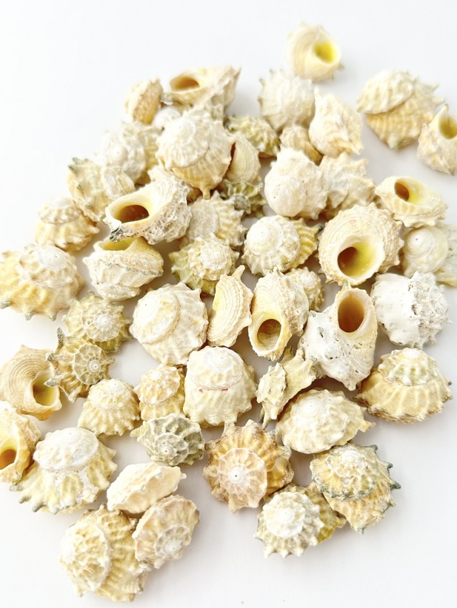 サザエの仲間。渦巻き状の小さなトゲが印象的なかわいい貝殻です。大きさによって異なりますが100gで20個前後入ってます。この商品は単品売りの商品と違いグラム売り用として仕入れたもので、主にディスプレイやクラフト材料用としてお安く提供させてもらっております。多少の割れや穴あき・石灰化等がありますことをご了承の上お買い求めください。