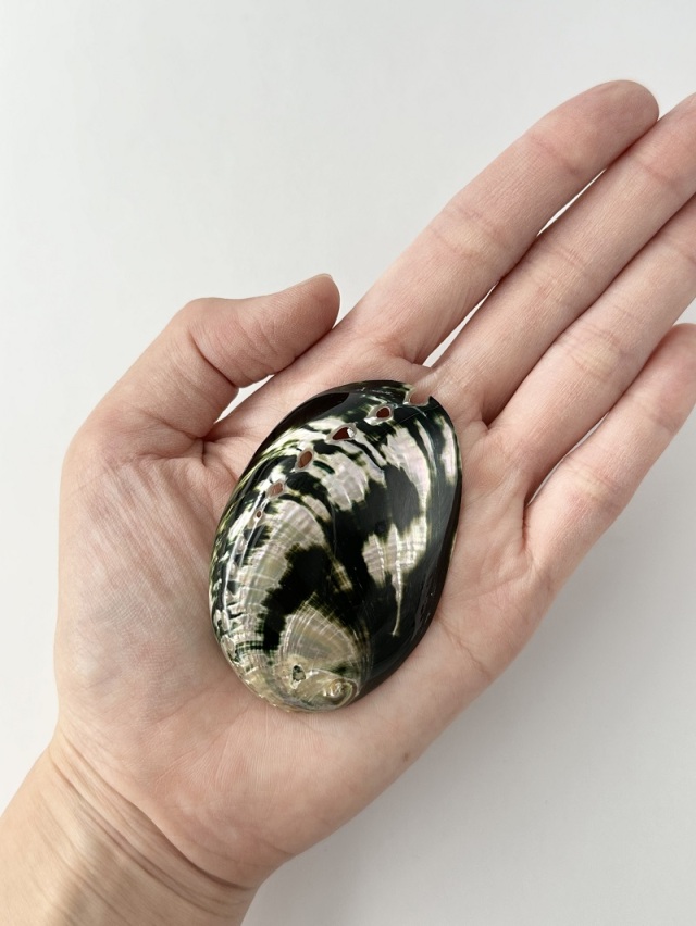 特徴のある柄模様・色をしたアワビです。色はダークグリーンに近い色です。