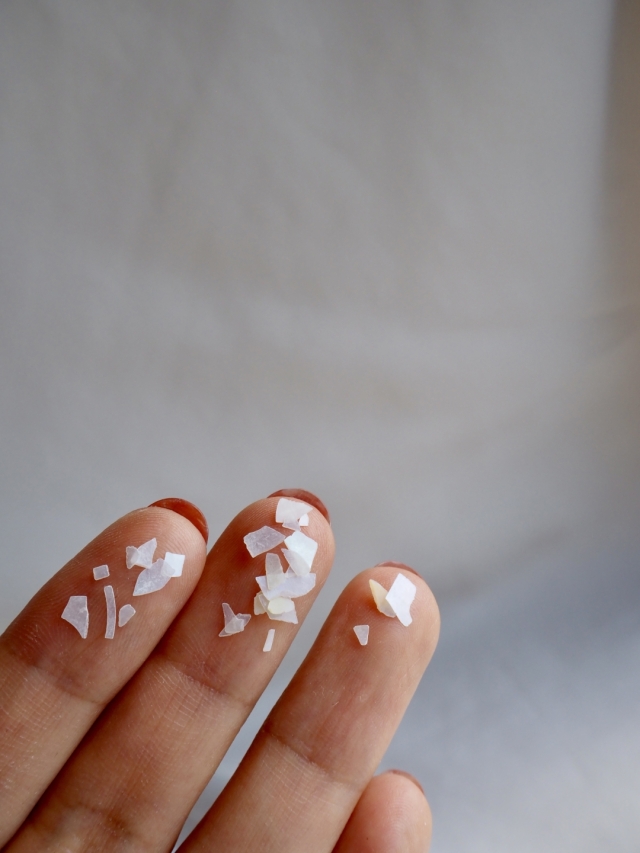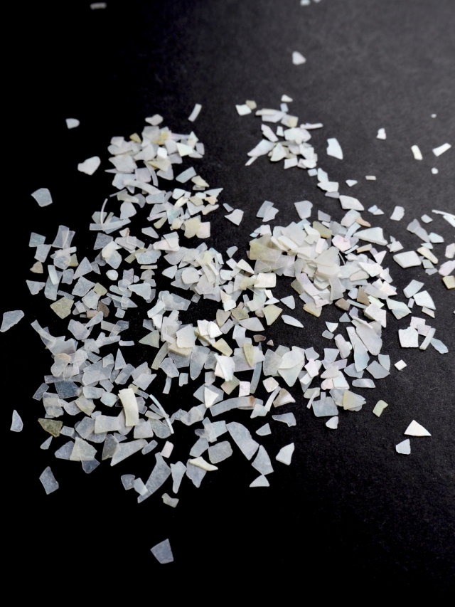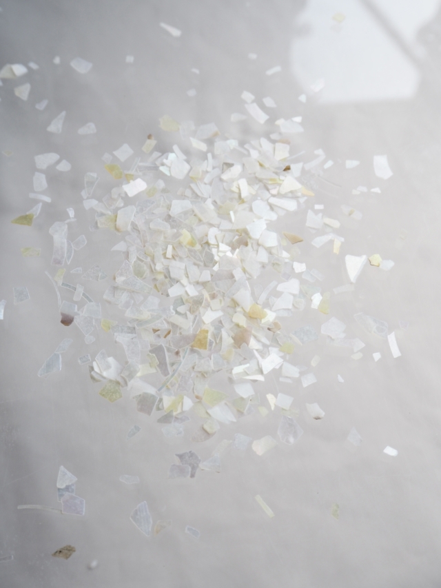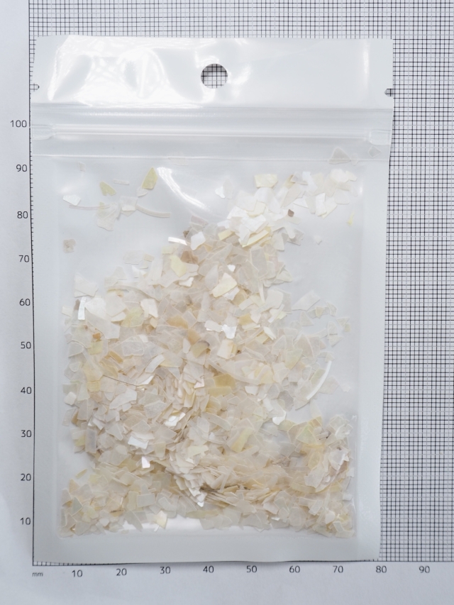 小さじ約2杯分です。マザーオブパールの一種、薄いシート状に加工したシロチョウガイを砕いたもの。貝殻ならではの透明感、きらきらとした真珠層の輝きが美しい商品です。レジンやネイルアートへの封入、キャンドルに混ぜ込んだり、貼り付けるデコレーションなどに使用できます。