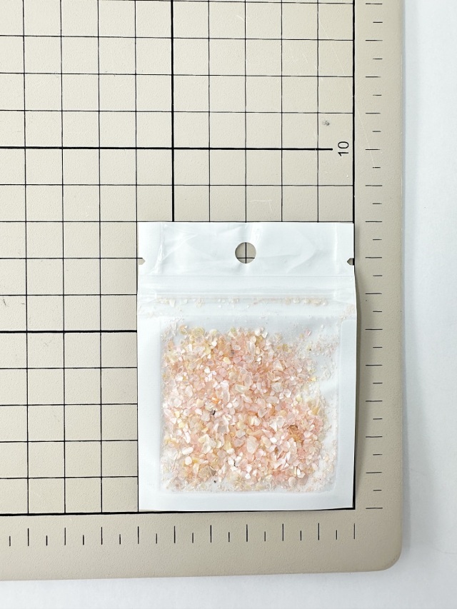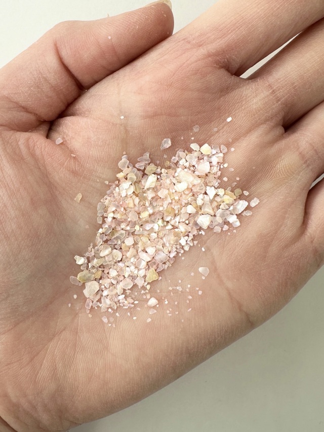 ピンクオレンジの色合いです。染色した貝殻を砕いたもの。貝殻ならではの光沢と透明感が美しい商品です。レジンやネイルアートへの封入、キャンドルに混ぜ込んだり、貼り付けるデコレーションなどに使用できます。