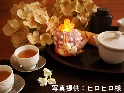 孔対(こうつい)という2対の孔が放射状に開いており、電球を入れてランプを作るのに適しています。殻が薄く1個25gほどと軽量なので吊るすのもおすすめ。エアープランツと組み合わせたウニクラゲも人気です。