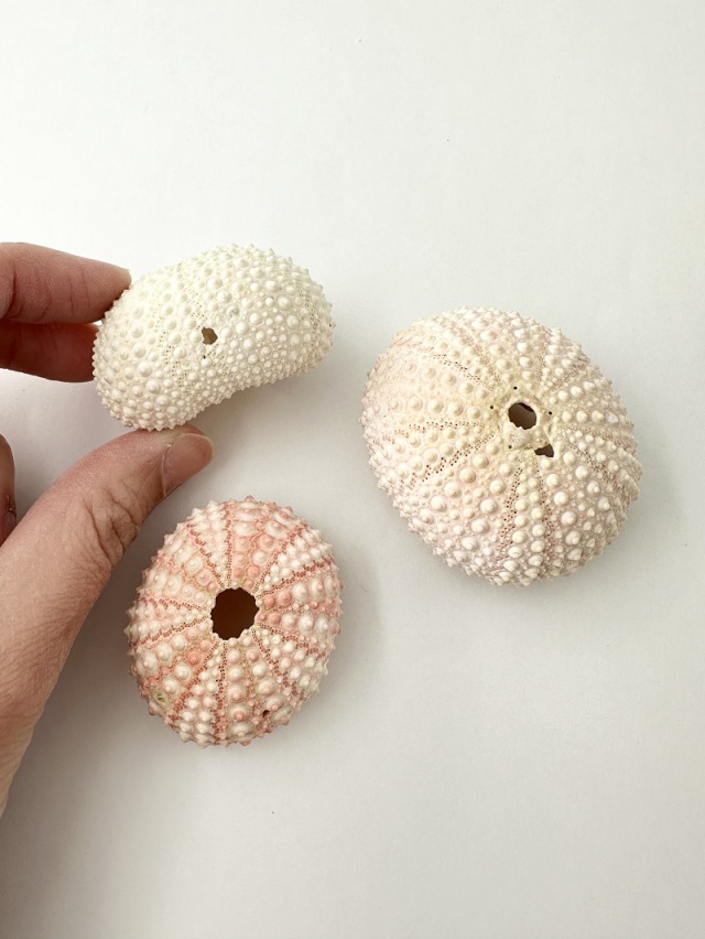 孔対(こうつい)という2対の孔が放射状に開いており、電球を入れてランプを作るのに適しています。殻が薄く1個10gほどと軽量なので吊るすのもおすすめ。エアープランツと組み合わせたウニクラゲも人気です。