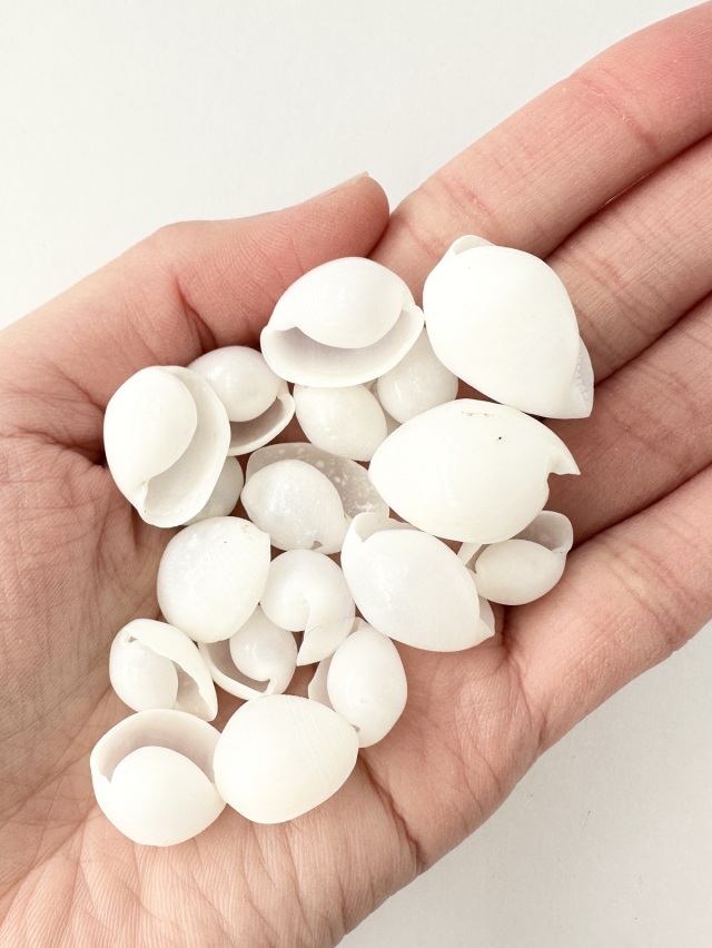 大小様々の大きさが入ってます。真っ白でツルツルで光沢があるとても可愛い貝殻で、思わず「可愛い!」って言っちゃいました。(笑)
